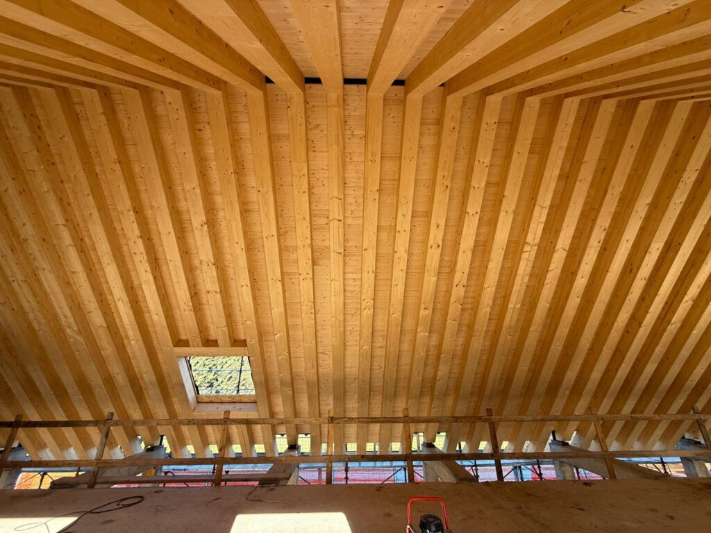 Il legno, protagonista assoluto del progetto, mostra tutta la sua forza e la sua poesia. Le perline, posate con cura, rivestono l’interno del tetto e creano un ritmo visivo caldo e naturale. Ogni elemento racconta l’attenzione dei carpentieri, ogni intreccio di fibre porta con sé l’idea di un edificio sostenibile, radicato nel territorio e nei suoi materiali.